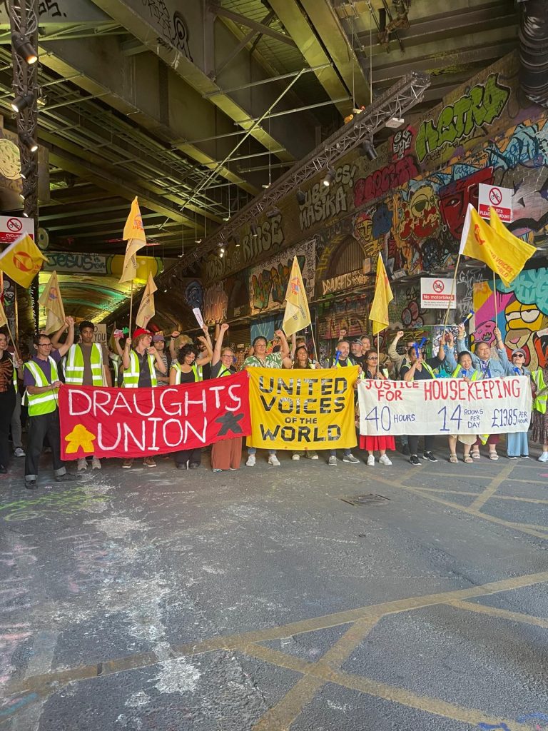 Draughts bar workers in Waterloo, Stratford and Hackney, and Radisson Blu Canary Wharf housekeeping staff who are part of the trade union United Voices of the World (UVW), walked out for the first time on Saturday 9 August after members voted 100% in favour of strike action.