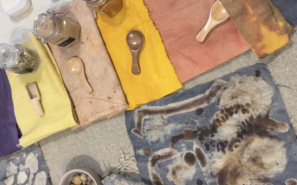 The workshop then moves into colour, introducing natural dyes including madder, indigo, cutch and weld, learning how plant-based pigment can be applied and used.